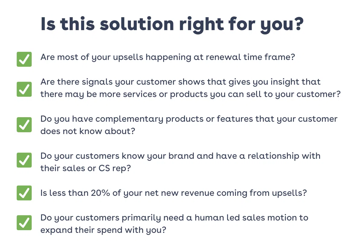 - Get buy-in from sales leadership on this. They must make expectations clear with the field that follow up on upsell opportunities is required (even if it’s just to close it with a reason!)